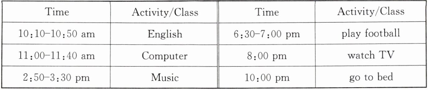 1. go to school 2. computer class 3. 2:50 4. home 5. Yes, he does.