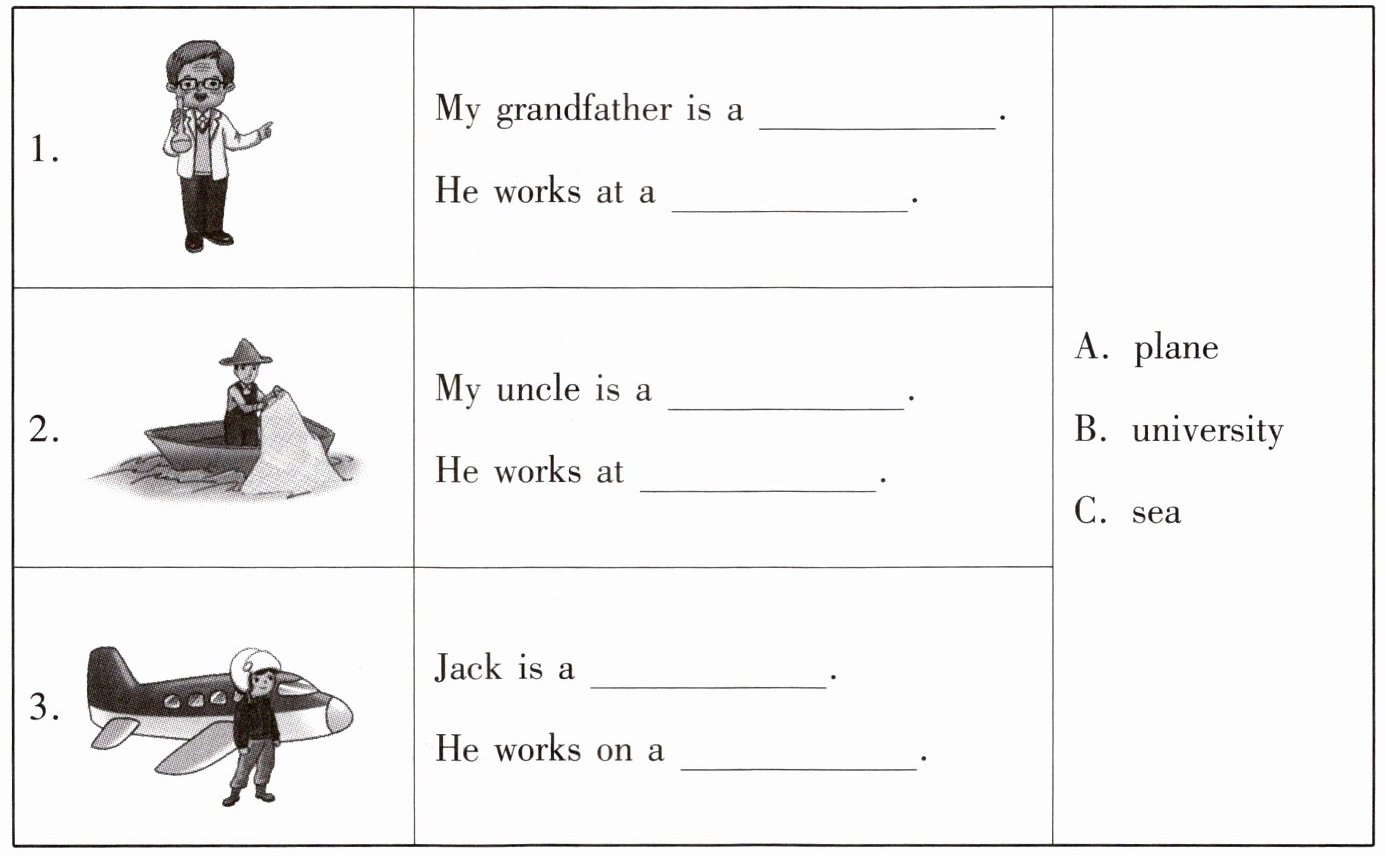 二、根据图片提示写出相应的职业名称,再选择相应的单词补全句子。