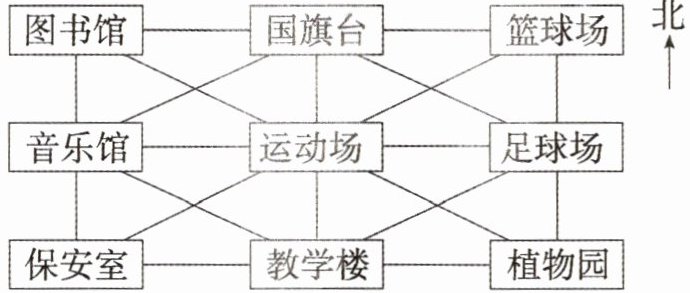 2. 运动场在国旗台的( )方向上,在教学楼的( )方向上,在图书馆的( )方向上,在植物园的( )方向上。