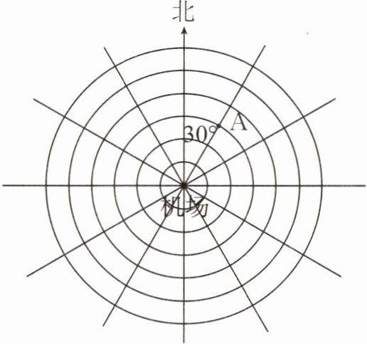 一、如图,这是一个飞机场的雷达屏幕,每相邻两个圆之间的距离表示20km。以机场为观测点,飞机A在北偏东30°方向60km处,飞机B、C、D、E的位置分别如下。请在图中标出4架飞机的位置。