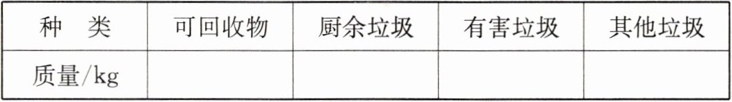 此处需根据实际调查情况填写表格,假设可回收物$3$kg,厨余垃圾$5$kg,有害垃圾$\frac{1}{2}$kg,其他垃圾$2$kg
