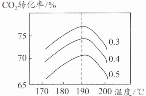 (8) 上图为某特定条件下,不同水碳比$[n(H_{2}O)/n(CO_{2})]$和温度影响$CO_{2}$转化率变化的趋势曲线。为了提高产率,提高二氧化碳的转化率,最优的反应条件应该是(填字母)。