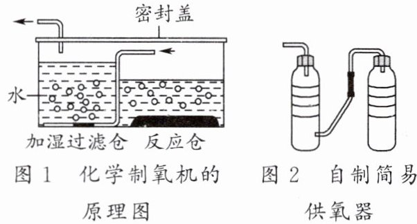 化学制氧机(原理图见图 1)利用过碳酸钠白色固体和二氧化锰黑色粉末制取氧气,过碳酸钠$(2Na_{2}CO_{3}·3H_{2}O_{2})$加水溶解会分解生成碳酸钠和过氧化氢。用该制氧机制取氧气时,在反应仓中加入适量水,再先后加入过碳酸钠和二氧化锰,反应仓内有黑色粉末翻腾,变得浑浊,仓壁变得温热,过滤仓底部导气管口有气泡冒出。