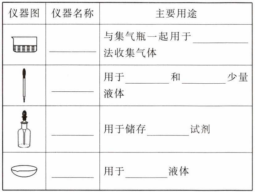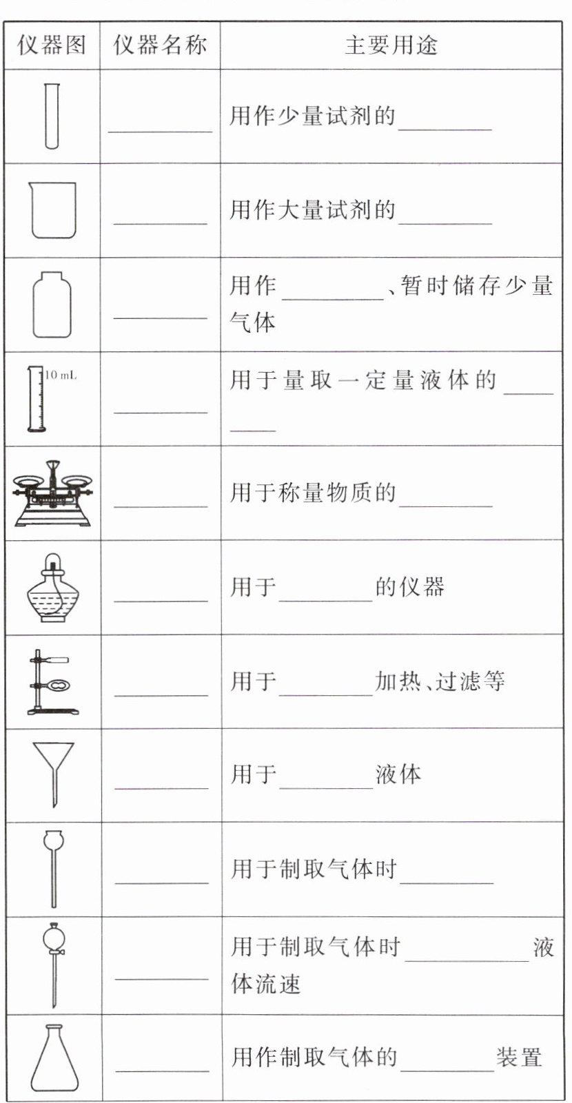 试管 反应容器 烧杯 反应容器 集气瓶 收集 量筒 体积 托盘天平 质量 酒精灯 加热 铁架台 支撑 漏斗 过滤 长颈漏斗 添加液体 分液漏斗 添加、控制 锥形瓶 发生 水槽 排水集气 胶头滴管 吸取 滴加 滴瓶 液体 蒸发皿 蒸发