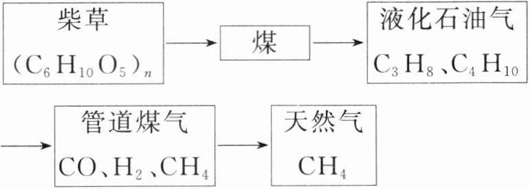 柴草(C₆H₁₀O₅)ₙ → 煤 → 液化石油气(C₃H₈、C₄H₁₀) → 管道煤气(CO、H₂、CH₄) → 天然气(CH₄)