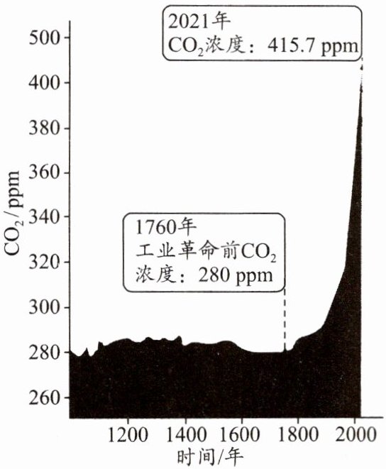 小组交流学习:根据教材中近1000年大气中CO₂浓度变化图回答问题。