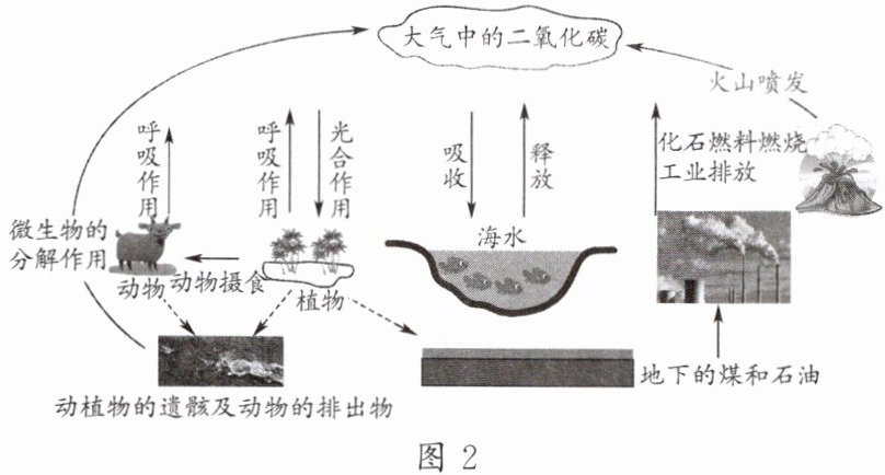 (2)观察图 2,基于“碳循环”视角,实现碳中和可以从两方面进行:①减少二氧化碳的排放;②
