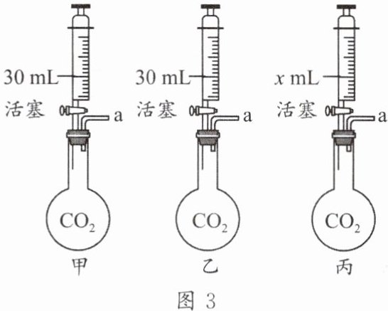 (3)图 3 中,甲、乙、丙注射器内的试剂分别是水、饱和石灰水、氢氧化钠浓溶液,x 的数值为____;由图 4 可知“捕捉”二氧化碳效果最好的是____(填装置序号),该装置中发生反应的化学方程式为____。
