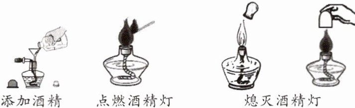 (2)“三不”:①酒精灯要用火柴点燃,不能用燃着的酒精灯去点燃另一个酒精灯;②切忌向燃着的酒精灯内添加酒精;③熄灭酒精灯时,应用