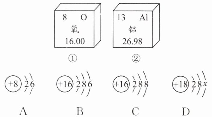 13. (滨州中考)元素周期表是学习和研究化学的重要工具。下图中①②为氧元素、铝元素在元素周期表中的信息示意图,A、B、C、D是四种粒子的结构示意图。试分析下图并回答问题。