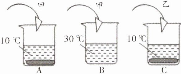 11. A、B、C三个烧杯中盛有相同质量的水(其中A、C烧杯中水温为10℃,B烧杯中水温为30℃,不考虑溶解过程中温度的变化),分别加入甲、乙两物质各10g,充分溶解后所得现象如下图所示,试回答: