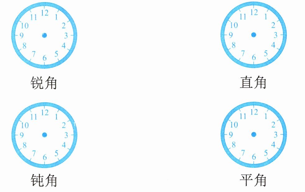 3. 在下面的钟面上画出时针和分针,形成指定的角。