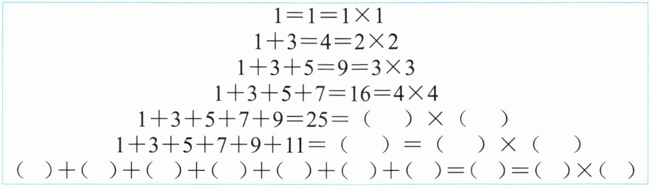 $ \begin{array} { r } { 1 = 1 = 1 × 1 } \\ { 1 + 3 = 4 = 2 × 2 } \\ { 1 + 3 + 5 = 9 = 3 × 3 } \\ { 1 + 3 + 5 + 7 = 16 = 4 × 4 } \\ { 1 + 3 + 5 + 7 + 9 = 25 = ( \quad ) × ( \quad ) } \\ { 1 + 3 + 5 + 7 + 9 + 11 = ( \quad ) = ( \quad ) × ( \quad ) } \\ { ( \quad ) + ( \quad ) + ( \quad ) + ( \quad ) + ( \quad ) + ( \quad ) + ( \quad ) = ( \quad ) = ( \quad ) × ( \quad ) } \end{array} $