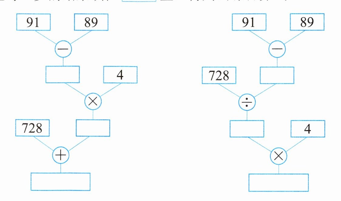 $\begin{matrix}91 & 89 \\\downarrow{-} & \\728 & □ \\\downarrow{÷} & \\□ & 4 \\\downarrow{×} & \\□ &\end{matrix}$