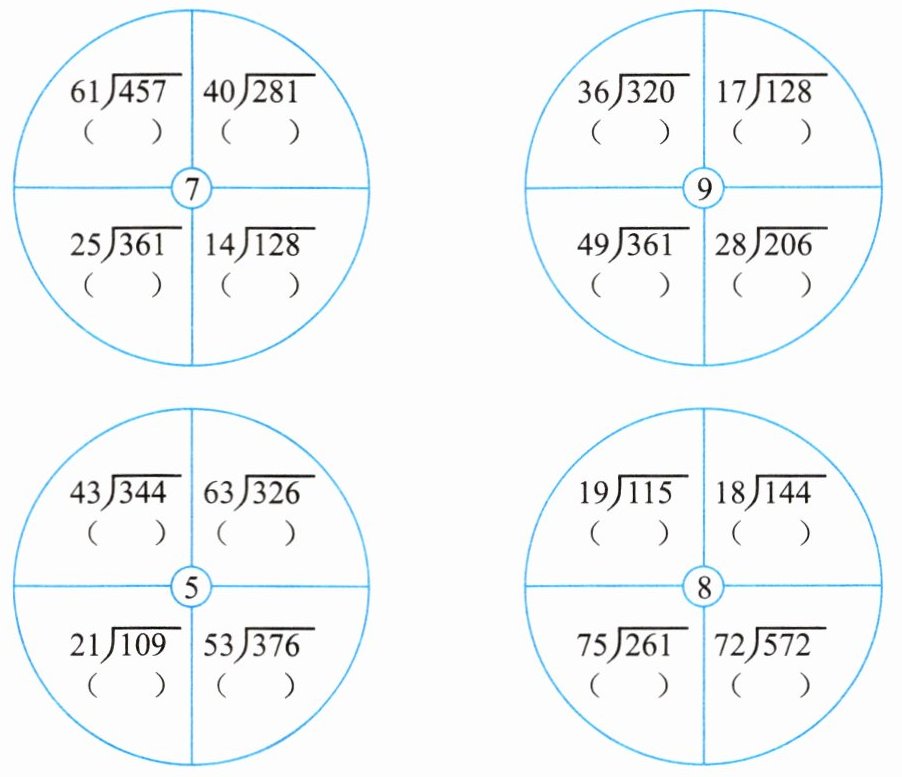 1. 大圆里每个算式的商是否与小圆里的数相同?相同的在()里画“√”,不同的在()里画“×”。
