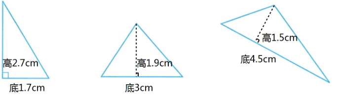 1. 分别测量下图中三角形的一条底边和它对应的高,并计算它们的面积。
