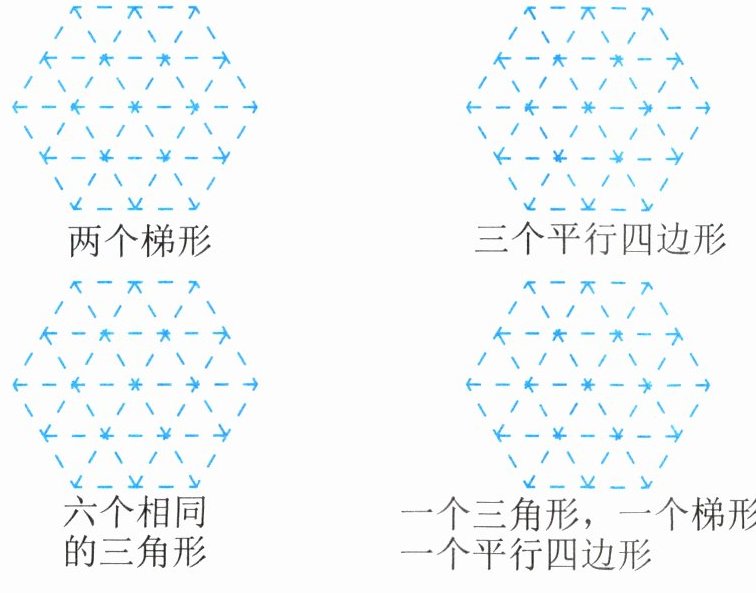 4. 你能分别按照下面的要求拼出一个六边形吗?想一想,画一画。