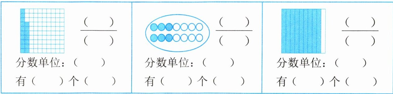 |$\frac{( )}{( )}$ 分数单位:( ) 有( )个( )|$\frac{( )}{( )}$ 分数单位:( ) 有( )个( )|$\frac{( )}{( )}$ 分数单位:( ) 有( )个( )|