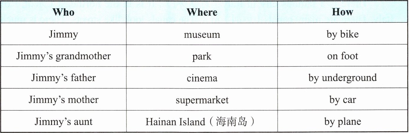 the park on foot. My father goes to the cinema by underground. My mother goes to the supermarket by car. My aunt goes to Hainan Island by plane.