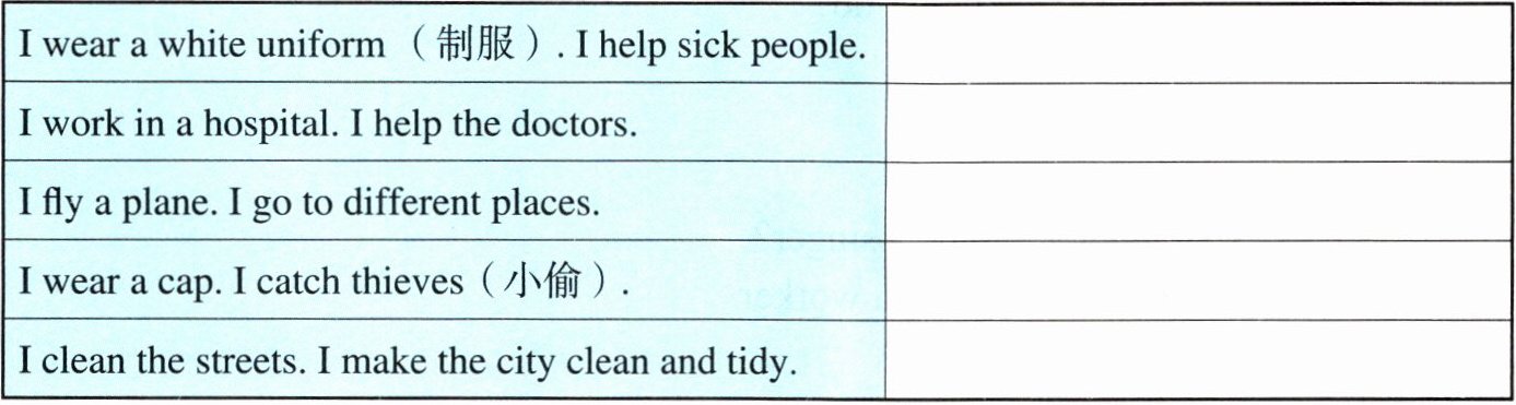 1. 同学们,你们了解每个职业的特点吗? 请先根据谜语提示猜一猜职业,再写一写以下人物的职业是什么。