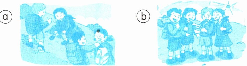 2. 今天是星期天,孩子们去爬山了,他们正在山上做什么呢?请你听一听,圈出与听到的内容相符的图片。