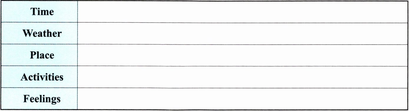 5. 同学们,你们班级组织过哪些有趣的外出活动呢?请你先在表格内填写相关信息,再以 An outing 为题写一写你们班级组织的一次外出活动。