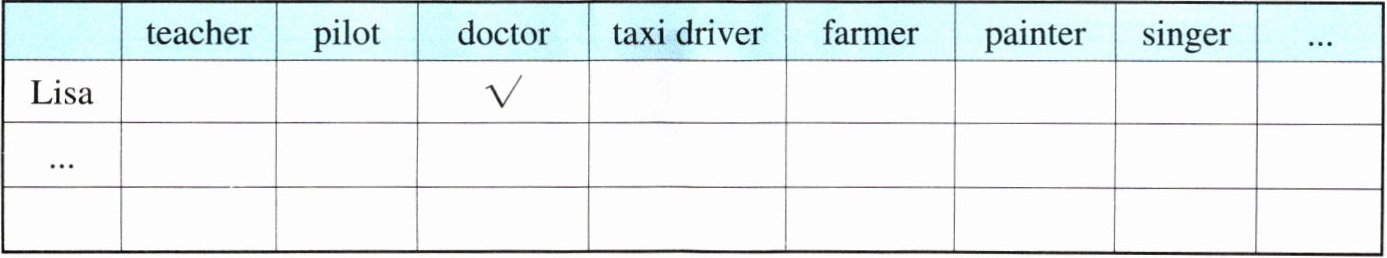 | | teacher | pilot | doctor | taxi driver | farmer | painter | singer |... |
