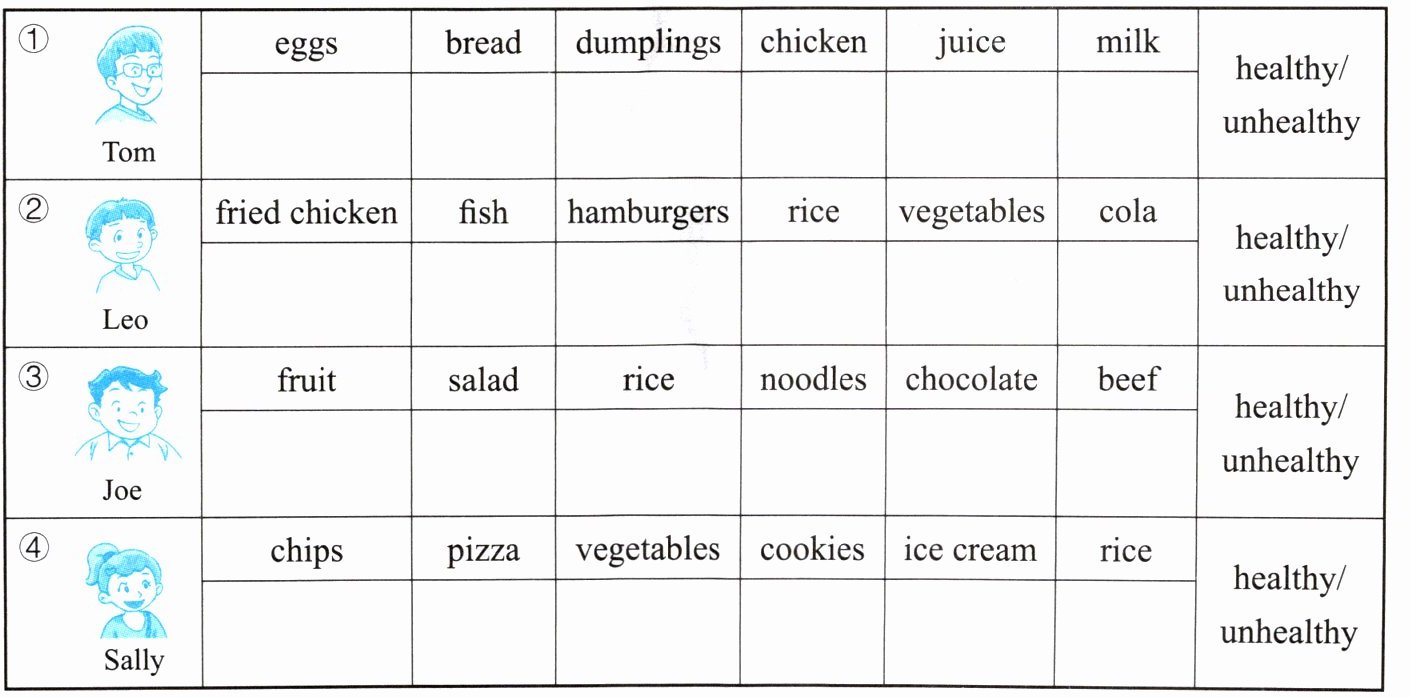 1. 老师正在调查同学们的饮食习惯。听一听,在听到的食物栏打“√”,再判断是否健康,并圈出来。