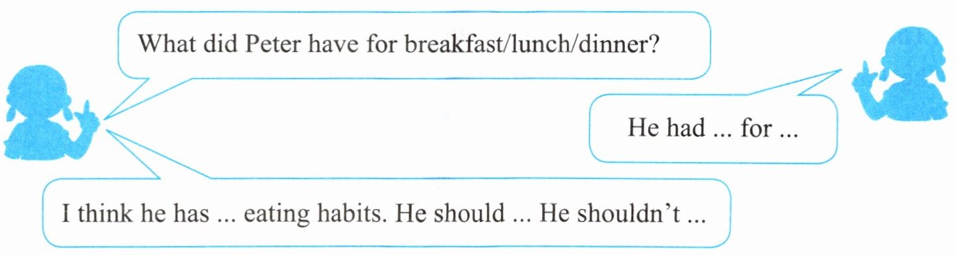 3. 口语交际:Peter一天都吃了什么?看表格,先谈一谈,再讨论他的饮食习惯是否健康,并提出你对Peter饮食习惯的建议。