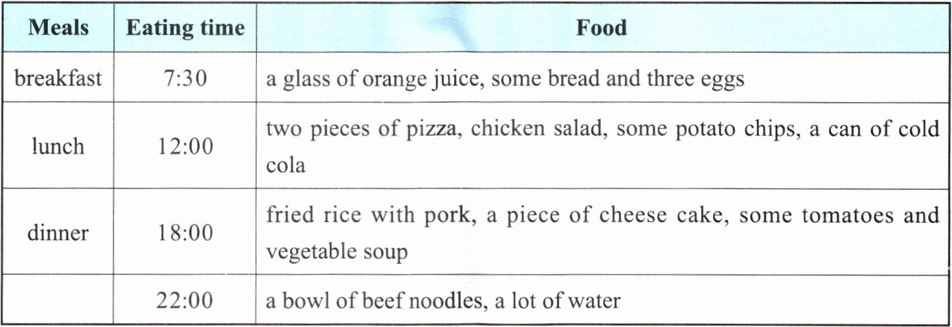 I think he has unhealthy eating habits. He should eat more healthy food and drink less cold cola. He shouldn’t eat potato chips. He shouldn’t have beef noodles at 22:00. He shouldn’t eat too much sweet food like cheese cake.