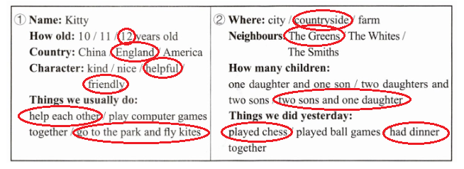 2. 两个同学有了新邻居,一起来了解一下吧。听一听,圈出正确的信息。