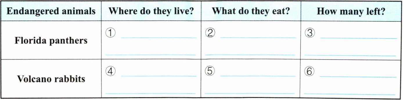 (1)①in the forests and swamps of southern Florida ②different kinds of animals ③ about seventy/70 ④on a volcano near Mexico City ⑤ fresh grass ⑥about one thousand two hundred/about 1,200