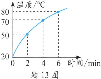 13. 小丽探究煤炉的热效率时,用煤炉给10kg的水加热,此过程中水温随时间变化情况如题13图所示。假设相同时间内煤炉燃烧煤的质量相等,若这些水从70℃升高到80℃燃烧了0.3kg的煤,则从50℃升高到70℃需要燃烧
