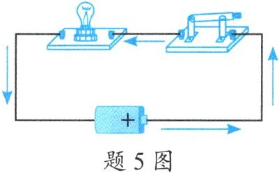 7. 电路的基本构成有4部分,分别是:电源、开关、导线和用电器。分析下列电路的设计,判断加着重号的文字在电路中的作用,写在最后一行相应空白处。