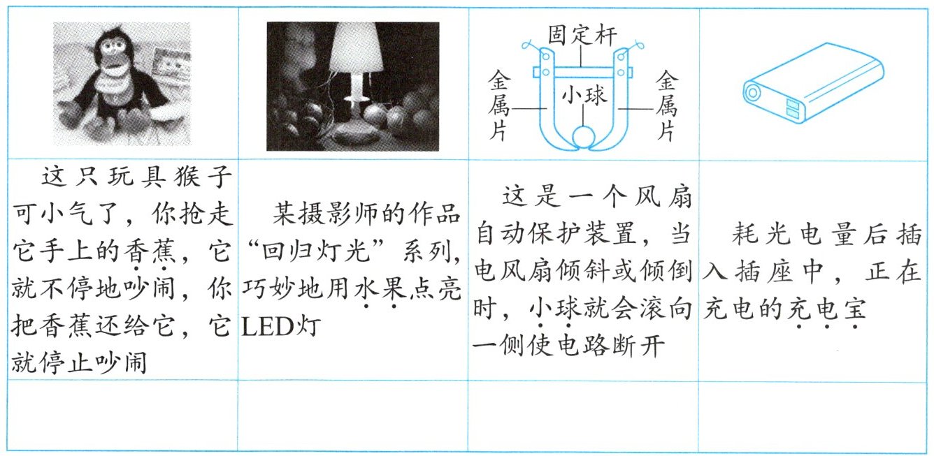 |这只玩具猴子可小气了,你抢走它手上的香蕉,它就不停地吵闹,你把香蕉还给它,它就停止吵闹|某摄影师的作品“回归灯光”系列,巧妙地用水果点亮LED灯|这是一个风扇自动保护装置,当电风扇倾斜或倾倒时,小球就会滚向一侧使电路断开|耗光电量后插入插座中,正在充电的充电宝|