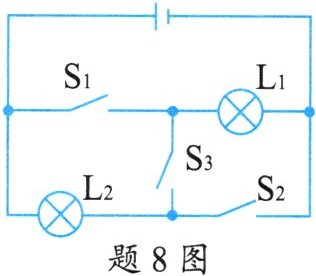 8. 如题8图所示,当只闭合 $ S_1 $ 和 $ S_2 $ 时,$ L_1 $、$ L_2 $ 的连接方式是