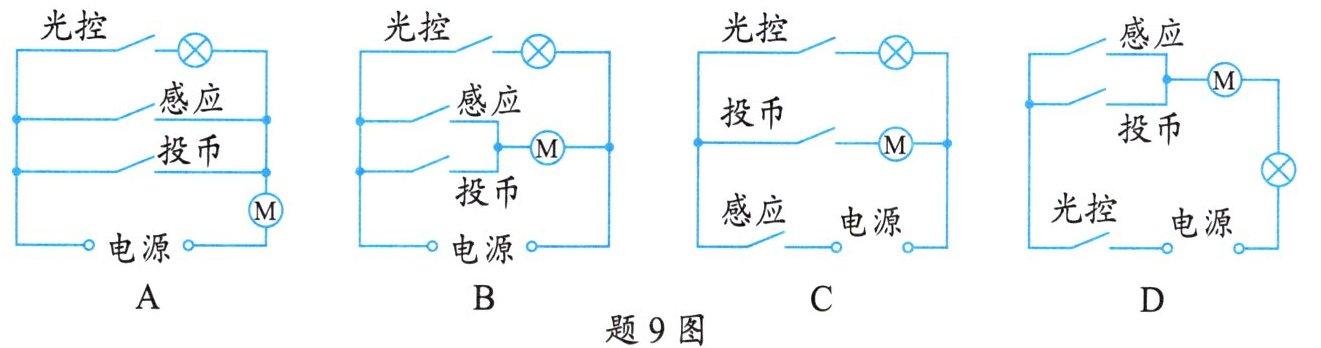 9. 某自动售货机,可通过手机扫码(感应开关闭合)或投币(投币开关闭合),启动电动机完成自动售货;在光线较暗时光控开关自动闭合,接通灯泡照明。符合上述情况的电路设计图是题9图中的(