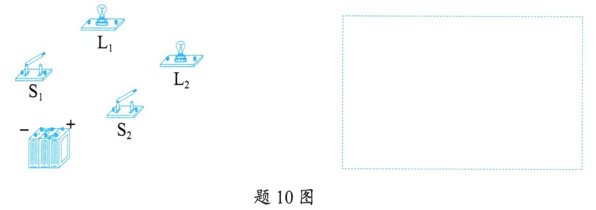 10. 请将题10图中的各器材连接成完整电路,要求灯 $ L_1 $ 和 $ L_2 $ 并联,开关 $ S_1 $ 只控制灯 $ L_1 $,开关 $ S_2 $ 控制灯 $ L_1 $ 和 $ L_2 $。完成连线后,在框内画出对应的电路图。