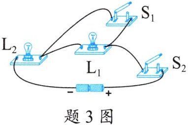 3. 如题3图所示的电路中,只闭合开关$S_{2}$时,两灯是______联的,电路处于______路状态。再闭合开关$S_{1}$时,请在虚线框内画出此时的等效电路图,由图可知:灯______亮,灯______不亮,原因是______;当$S_{1}$、$S_{2}$均断开时,电路处于______路状态。