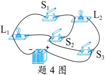 4. 题4图电路中,只闭合开关$S_{2}$,则灯$L_{1}和L_{2}$______联,请在虚线框内画出此时的等效电路图。若要使$L_{1}和L_{2}$并联,应闭合开关______;若同时闭合开关______,将烧毁电源。