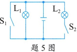 5. 如题5图所示的电路,当断开开关$S_{1}$,闭合开关$S_{2}$,此时灯泡$L_{1}和L_{2}$______联。当同时闭合开关$S_{1}和S_{2}$,请在虚线框内画出等效电路图,由图可知:灯泡$L_{1}和灯泡L_{2}$______(发光/不发光),此时的电路状态是______路。