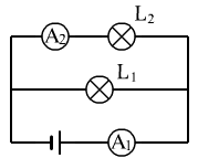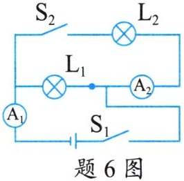 6. 如题6图所示的电路,只闭合$S_{1}$时,能够发光的灯泡是______,$A_{1}$测的是通过灯______的电流;同时闭合$S_{1}$、$S_{2}$时,请在虚线框内画出此时的等效电路图,此时:$L_{1}$、$L_{2}$______联,$A_{2}$测的是通过灯______的电流。