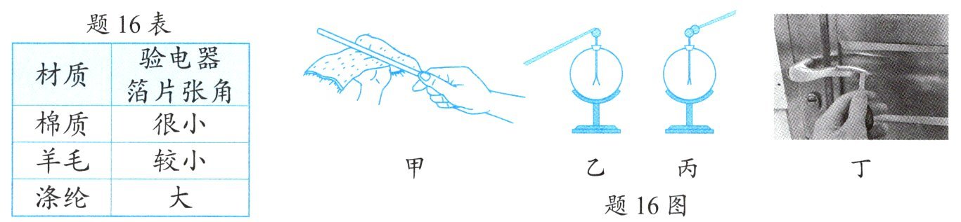 材料衣服上重复(1)的操作,长棒与验电器金属球接触后的现象如题16图丙所示。请由此提出一条减少静电的生活建议:给房间加湿