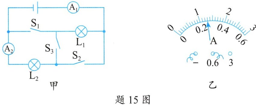 (2)当只闭合$S_{1}$、$S_{2}$时,电流表$A_{2}$示数如题15图乙所示,电流表$A_{1}的示数为0.5 A$,通过$L_{1}$的电流是多少?