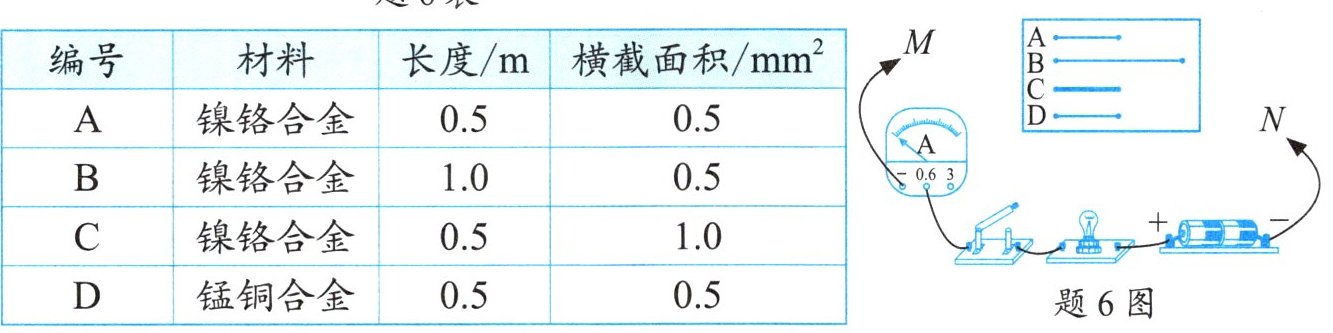 6. 在探究“影响导体电阻大小的因素”时,小明同学猜想导体的电阻与导体的以下因素有关:①长度;②横截面积;③材料;④温度。实验室提供了4根不同规格的电阻丝,规格、材料见题6表。
