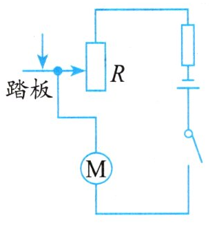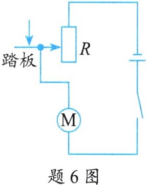 6. 为了减少碳排放,国家大力推行电动汽车。通过电动机的电流越大,电动汽车的速度越快,当驾驶员向下踩“油门”踏板时,车速变大。有同学提出右侧模拟电路存在问题,请你在题6图中修正,使其满足题目要求。