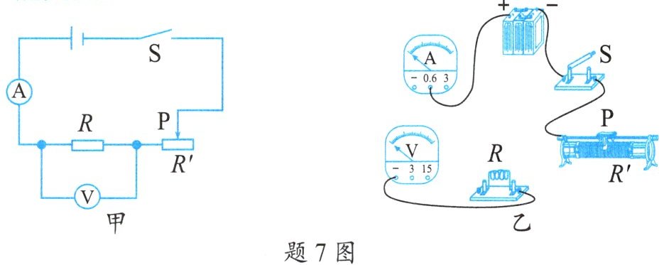 7. 请根据题7图甲电路图,用笔画线代替导线将题7图乙中的电路连接完整(导线不能交叉)。