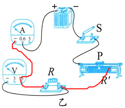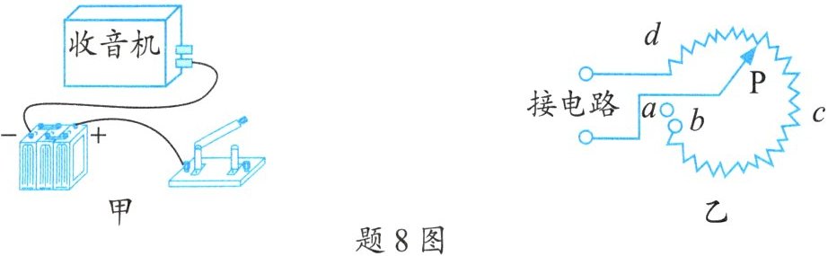 如题8图乙所示的是一种调节收音机音量兼开关的电位器示意图,请将其连入题8图甲的收音机电路中。此时电流流过的是