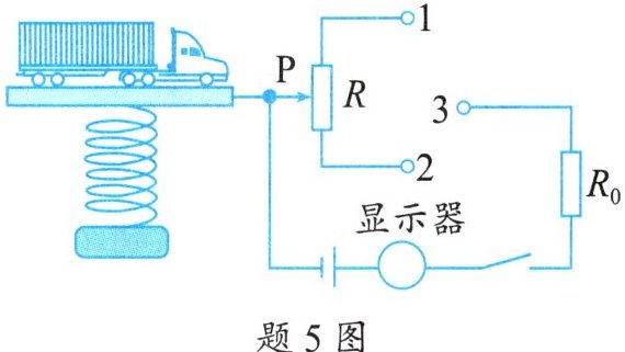 5. 公路检查站的“地磅”可以检测货车是否超载。题5图是某种地磅的工作原理图,滑片P可在竖直放置的电阻R上滑动,当货车质量增大时,电表示数随之增大,由电表改装成的显示器的示数也增大。接线柱“3”应该与“