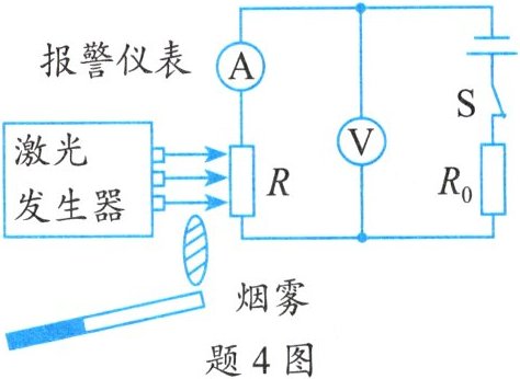 4. 题4图是物理兴趣小组设计的烟雾报警电路图,开关S处于闭合状态,$R_{0}$是定值电阻,$R$为感光电阻,光照越强,阻值越小。烟雾浓度增大时射向$R$的光被遮挡,$R$受到的光照变弱。当烟雾浓度增大时,下列判断正确的是(
